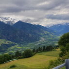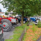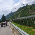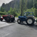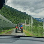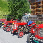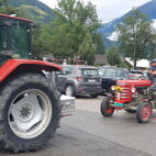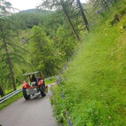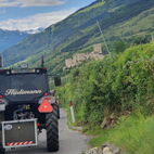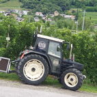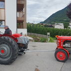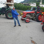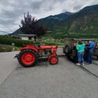 Wie lange das Passaiertal ist, merkten sie dann am nächsten Tag, kaum enden wollend. Meran zu durchfahren mit 15 Fahrzeugen und dabei niemanden zu verlieren, war eine Herausforderung, die aber auch gemeistert wurde. Jedes Gespann achtete auf das folgende. Nach einer kurzen Sammelpause kam die Abschleppstange wieder zum Einsatz. Derselbe Unglücksrabe wie am Vortag. Diesmal waren es die Lager die heiss liefen. Um weitere Schäden zu vermeiden, wurde er wieder ins Schlepptau genommen. Kreuz und quer durch die Obstplantagen des Vinschgaus, zuckelten sie nun in Richtung Reschenpass, diesen überquerten sie aber nicht. Nach dem Mitttagessen und anschliessender kurzer Irrfahrt befuhren sie wieder denselben Höhenweg, hoch über dem Tal, auf welchem sie das letzte Mal eine Panne hatten. Diesmal zum Glück nicht wieder. Das Gespann mit dem abgeschleppten Traktor nahm den direkten Weg nach Glurns ins Hotel. In den Obstplantagen werden sie wohl in nächster Zeit keine Pestizide mehr einsetzen müssen.